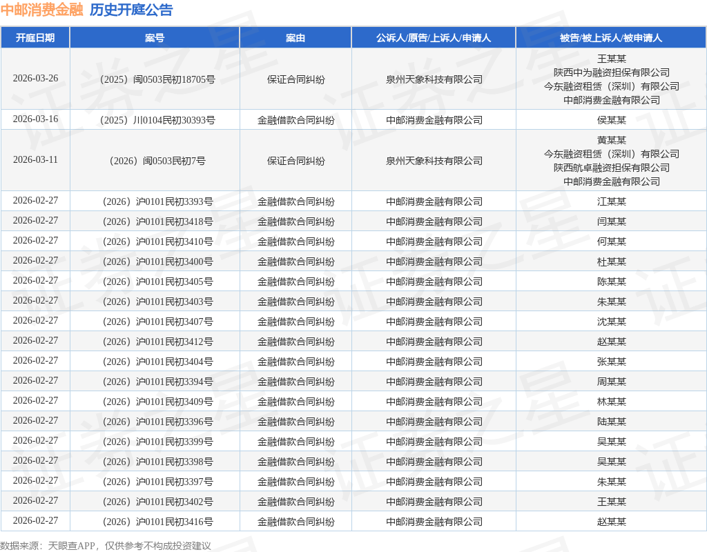 案号:(2026)闽0503民初7号根据统计,近一年内以中邮消费金融有限公司为当事人的历史开庭公告有2729则,其中案由为“金融借款合同纠纷”的公告以2604则居首,其次为“借款合同纠纷”有93则,“小额借款合同纠纷”有15则。历史开庭公告(前20条)如下: