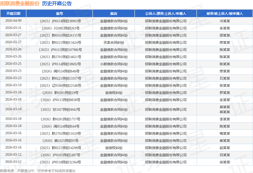 案号:(2026)闽0103民初325号根据统计,近一年内以招联消费金融股份有限公司为当事人的历史开庭公告有884则,其中案由为“金融借款合同纠纷”的公告以669则居首,其次为“借款合同纠纷”有122则,“小额借款合同纠纷”有64则。历史开庭公告(前20条)如下: