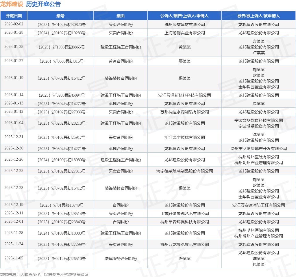 案号:(2025)浙0102民初30820号根据统计,近一年内以龙邦建设股份有限公司为当事人的历史开庭公告有73则,其中案由为“买卖合同纠纷”的公告以24则居首,其次为“合同纠纷”有12则,“建设工程施工合同纠纷”有11则。历史开庭公告(前20条)如下: