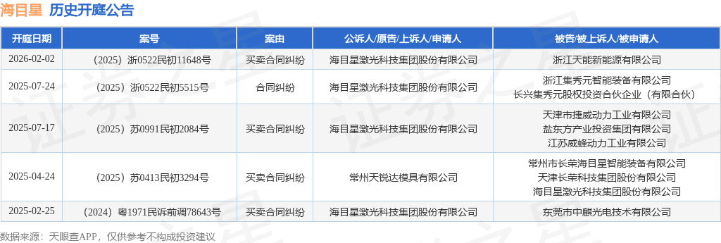 根据统计,近一年内以海目星激光科技集团股份有限公司为当事人的历史开庭公告有5则,其中案由为“买卖合同纠纷”的公告以4则居首,其次为“合同纠纷”有1则。历史开庭公告如下: