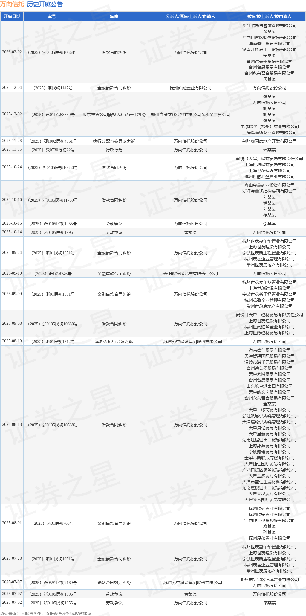 案号:(2025)浙0105民初10568号根据统计,近一年内以万向信托股份公司为当事人的历史开庭公告有30则,其中案由为“金融借款合同纠纷”的公告以7则居首,其次为“借款合同纠纷”有6则,“劳动争议”有6则。历史开庭公告(前20条)如下: