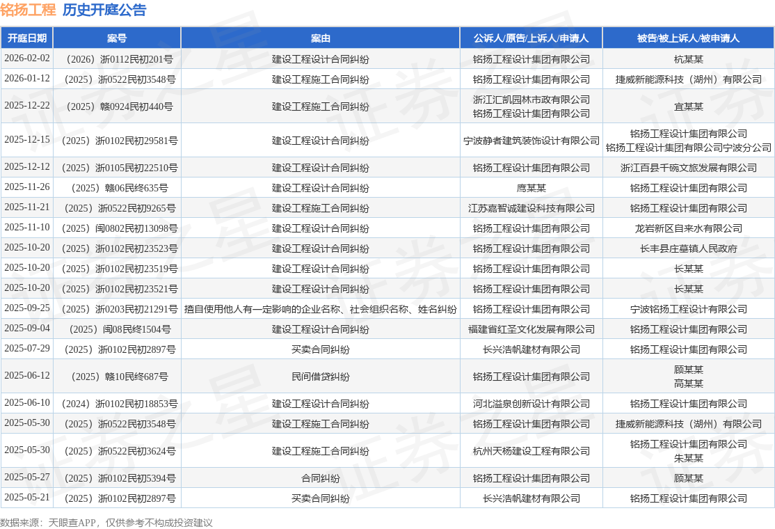案号:(2026)浙0112民初201号根据统计,近一年内以铭扬工程设计集团有限公司为当事人的历史开庭公告有26则,其中案由为“建设工程设计合同纠纷”的公告以13则居首,其次为“建设工程施工合同纠纷”有7则,“买卖合同纠纷”有2则。历史开庭公告(前20条)如下: