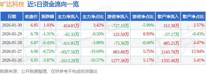 证券之星消息,截至2026年1月30日收盘,旷达科技(002516)报收于6.85元,上涨1.03%,换手率1.22%,成交量17.84万手,成交额1.21亿元。