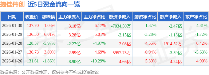 1月30日的资金流向数据方面,主力资金净流入3.18亿元,占总成交额6.17%,游资资金净流出7034.5万元,占总成交额1.37%,散户资金净流出2.47亿元,占总成交额4.81%。