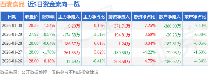 证券之星消息,截至2026年1月30日收盘,西麦食品(002956)报收于28.35元,上涨1.54%,换手率0.82%,成交量1.82万手,成交额5127.35万元。