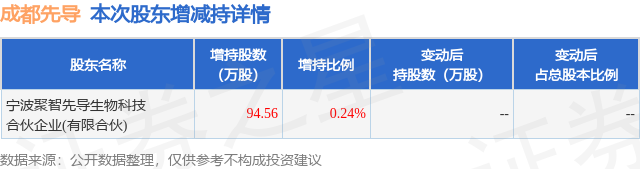 证券之星消息,1月30日成都先导发布公告《成都先导:成都先导药物开发股份有限公司关于控股股东、实际控制人之一致行动人宁波聚智先导生物科技合伙企业(有限合伙)增持公司股份计划实施完毕暨增持结果公告》,其股东宁波聚智先导生物科技合伙企业(有限合伙)于2025年10月13日至2026年1月30日间合计增持94.56万股,占公司目前总股本的0.236%,变动期间该股股价上涨31.82%,截止1月30日收盘报31.11元。