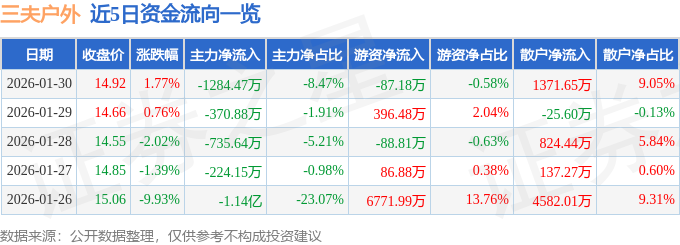 证券之星消息,截至2026年1月30日收盘,三夫户外(002780)报收于14.92元,上涨1.77%,换手率7.8%,成交量10.19万手,成交额1.52亿元。
