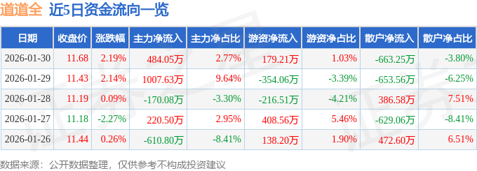 证券之星消息,截至2026年1月30日收盘,道道全(002852)报收于11.68元,上涨2.19%,换手率5.26%,成交量15.0万手,成交额1.75亿元。