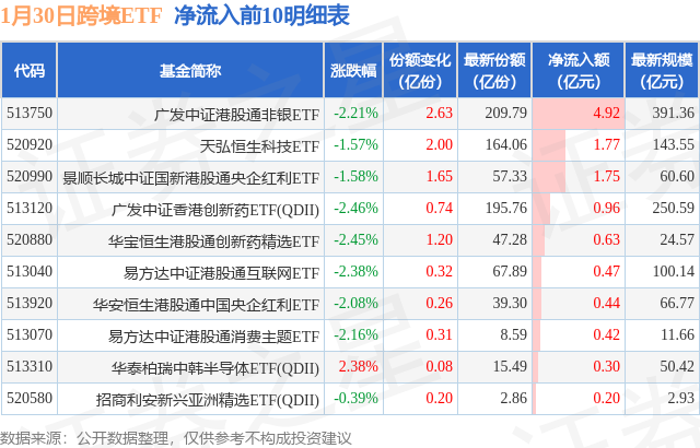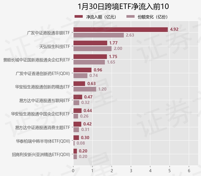 当日有32只跨境ETF基金出现资金净流入,其中净流入排首位的是广发中证港股通非银ETF(513750),份额增加了2.63亿份,净流入额为4.92亿元。