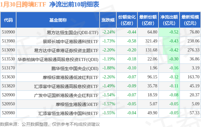 当日有22只跨境ETF基金出现资金净流出,其中净流出排首位的是易方达恒生国企(QDII-ETF)(510900),份额减少了4400.0万份,净流出额为5206.11万元。