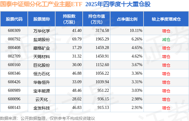 国泰中证细分化工产业主题ETF基金成立于2021年3月2日,基金经理为王玉,基金跟踪标的为中证细分化工产业主题全收益指数,成立以来超额回报为11.2%,近一个月超额回报为-0.13%。最新披露的基金持仓数据显示,截止2025年12月31日,该基金第一大重仓股为万华化学(600309),持股占比为10.11%。