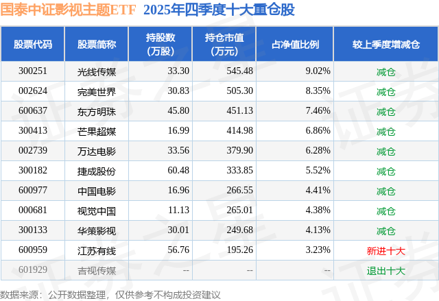 国泰中证影视主题ETF基金成立于2021年10月20日,基金经理为王玉,基金跟踪标的为中证影视主题指数,成立以来超额回报为-4.73%,近一个月超额回报为-0.09%。最新披露的基金持仓数据显示,截止2025年12月31日,该基金第一大重仓股为光线传媒(300251),持股占比为9.02%。