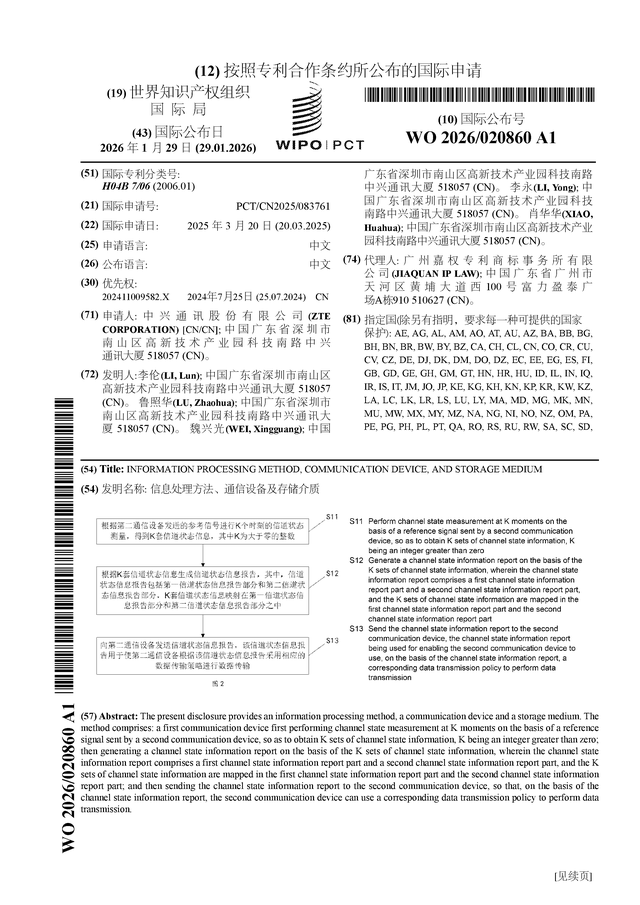 证券之星消息,根据企查查数据显示中兴通讯(000063)公布了一项国际专利申请,专利名为“信息处理方法、通信设备及存储介质”,专利申请号为PCT/CN2025/083761,国际公布日为2026年1月29日。