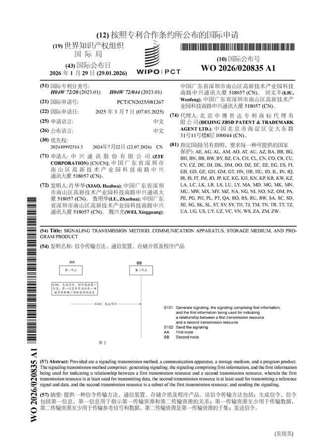 证券之星消息,根据企查查数据显示中兴通讯(000063)公布了一项国际专利申请,专利名为“信令传输方法、通信装置、存储介质及程序产品”,专利申请号为PCT/CN2025/081267,国际公布日为2026年1月29日。