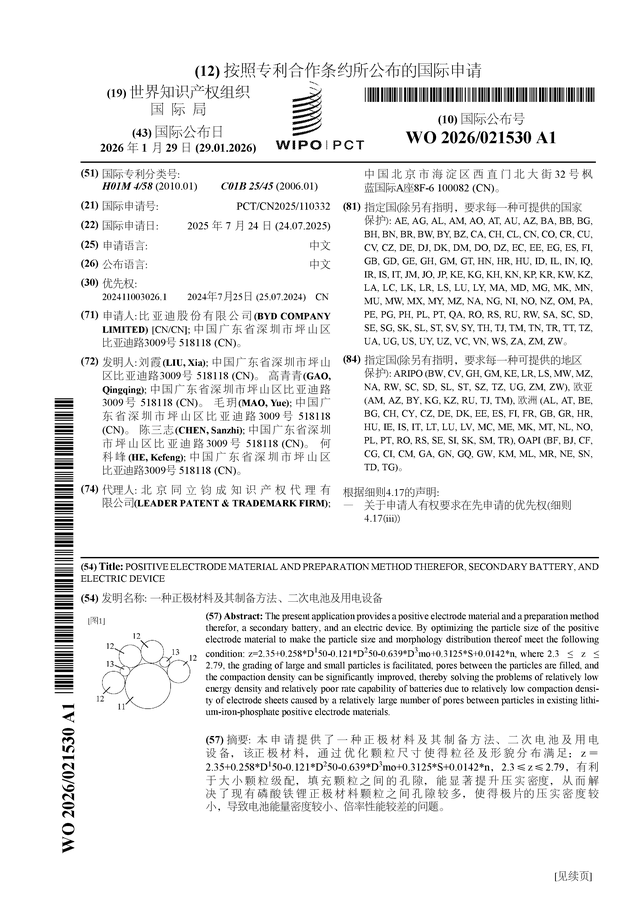 证券之星消息,根据企查查数据显示比亚迪(002594)公布了一项国际专利申请,专利名为“一种正极材料及其制备方法、二次电池及用电设备”,专利申请号为PCT/CN2025/110332,国际公布日为2026年1月29日。