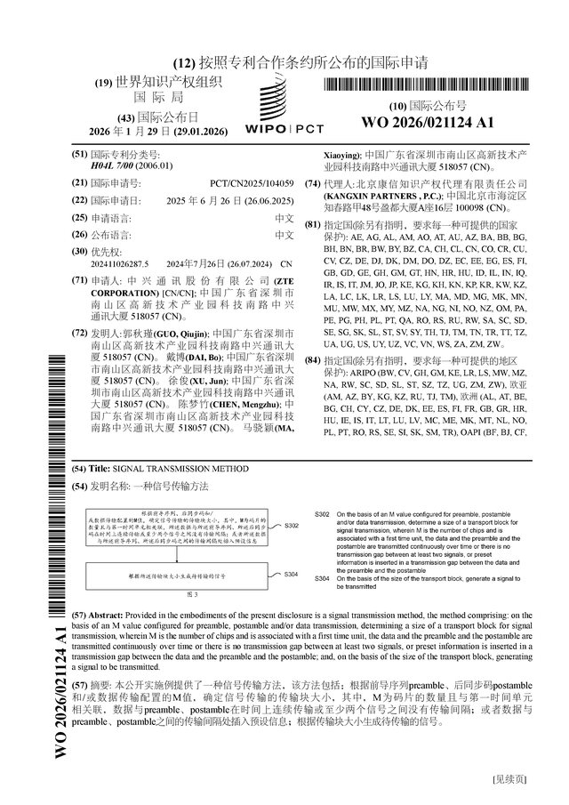 证券之星消息,根据企查查数据显示中兴通讯(000063)公布了一项国际专利申请,专利名为“一种信号传输方法”,专利申请号为PCT/CN2025/104059,国际公布日为2026年1月29日。
