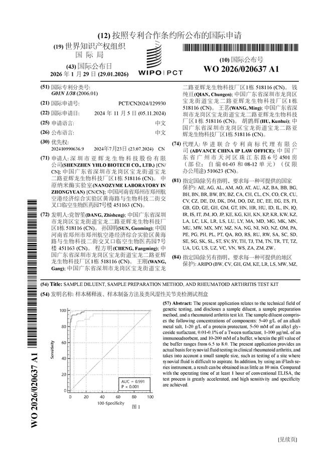 证券之星消息,根据企查查数据显示亚辉龙(688575)公布了一项国际专利申请,专利名为“样本稀释液、样本制备方法及类风湿性关节炎检测试剂盒”,专利申请号为PCT/CN2024/129930,国际公布日为2026年1月29日。