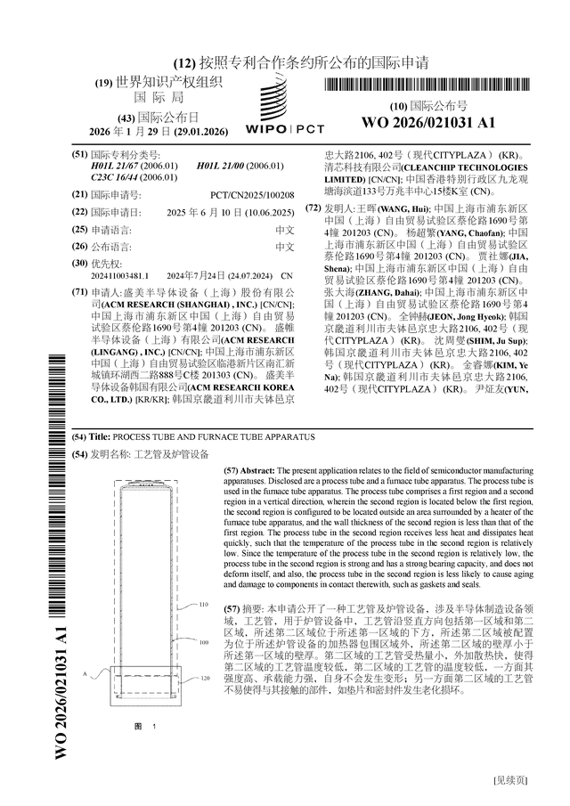 证券之星消息,根据企查查数据显示盛美上海(688082)公布了一项国际专利申请,专利名为“工艺管及炉管设备”,专利申请号为PCT/CN2025/100208,国际公布日为2026年1月29日。