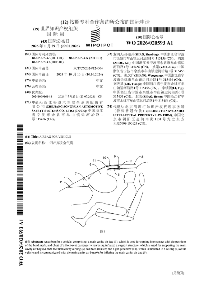 证券之星消息,根据企查查数据显示松原安全(300893)公布了一项国际专利申请,专利名为“一种汽车安全气囊”,专利申请号为PCT/CN2024/124004,国际公布日为2026年1月29日。
