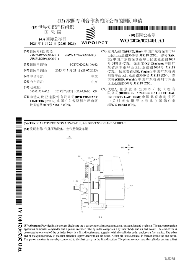 证券之星消息,根据企查查数据显示比亚迪(002594)公布了一项国际专利申请,专利名为“气体压缩设备、空气悬架及车辆”,专利申请号为PCT/CN2025/109662,国际公布日为2026年1月29日。