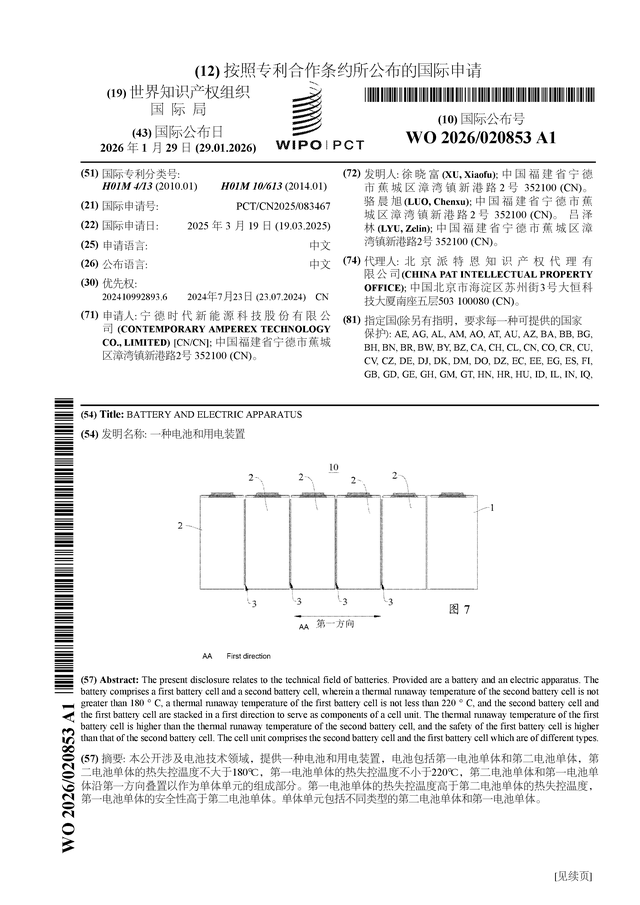 证券之星消息,根据企查查数据显示宁德时代(300750)公布了一项国际专利申请,专利名为“一种电池和用电装置”,专利申请号为PCT/CN2025/083467,国际公布日为2026年1月29日。