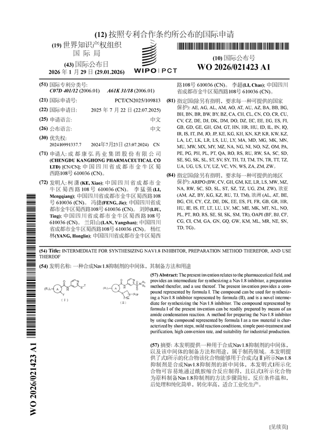 证券之星消息,根据企查查数据显示康弘药业(002773)公布了一项国际专利申请,专利名为“一种合成Nav1.8抑制剂的中间体,其制备方法和用途”,专利申请号为PCT/CN2025/109813,国际公布日为2026年1月29日。