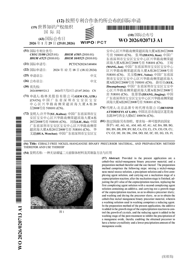 证券之星消息,根据企查查数据显示格林美(002340)公布了一项国际专利申请,专利名为“一种无钴镍锰二元前驱体材料及其制备方法与应用”,专利申请号为PCT/CN2024/140404,国际公布日为2026年1月29日。
