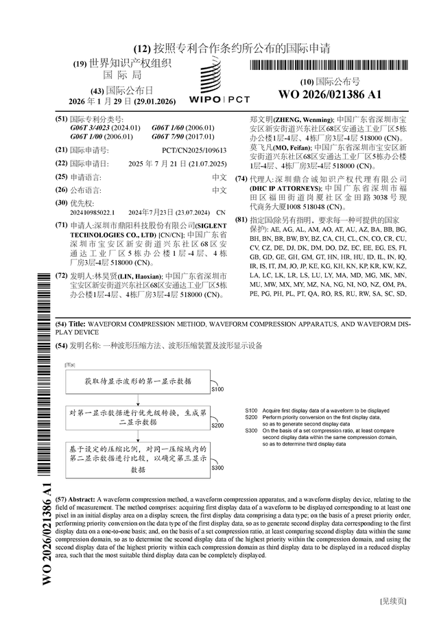 证券之星消息,根据企查查数据显示鼎阳科技(688112)公布了一项国际专利申请,专利名为“一种波形压缩方法、波形压缩装置及波形显示设备”,专利申请号为PCT/CN2025/109613,国际公布日为2026年1月29日。