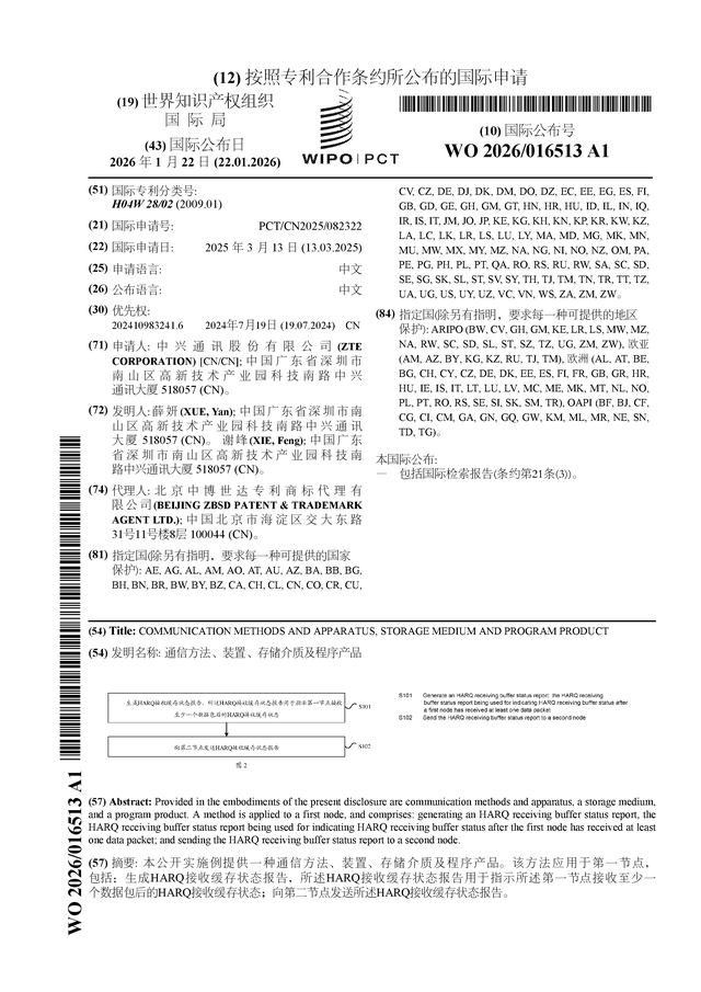 证券之星消息,根据企查查数据显示中兴通讯(000063)公布了一项国际专利申请,专利名为“通信方法、装置、存储介质及程序产品”,专利申请号为PCT/CN2025/082322,国际公布日为2026年1月22日。