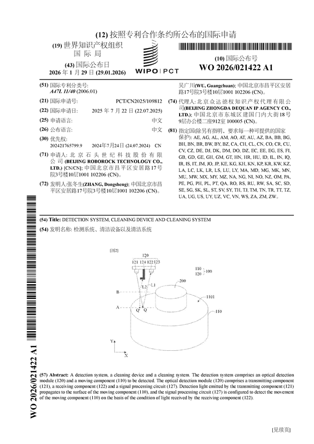 证券之星消息,根据企查查数据显示石头科技(688169)公布了一项国际专利申请,专利名为“检测系统、清洁设备以及清洁系统”,专利申请号为PCT/CN2025/109812,国际公布日为2026年1月29日。