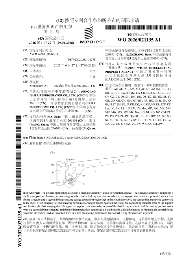 证券之星消息,根据企查查数据显示海尔智家(600690)公布了一项国际专利申请,专利名为“搁架组件和制冷设备”,专利申请号为PCT/CN2025/104275,国际公布日为2026年1月29日。