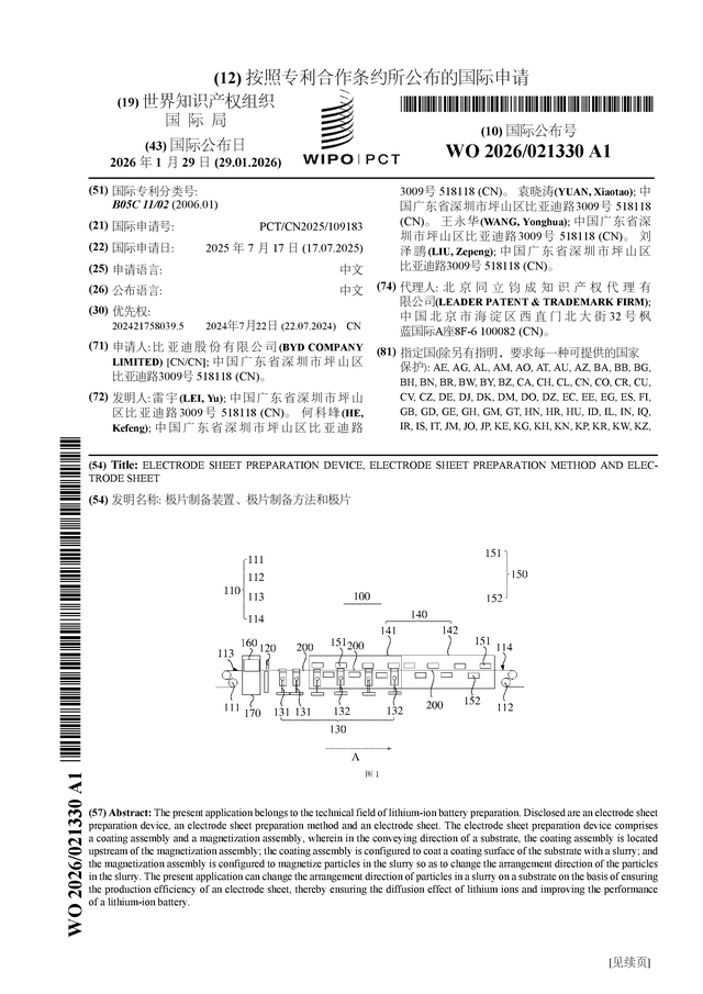 证券之星消息,根据企查查数据显示比亚迪(002594)公布了一项国际专利申请,专利名为“极片制备装置、极片制备方法和极片”,专利申请号为PCT/CN2025/109183,国际公布日为2026年1月29日。