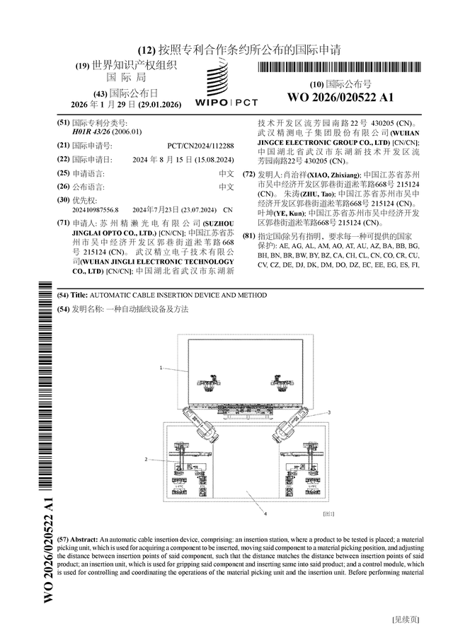 证券之星消息,根据企查查数据显示精测电子(300567)公布了一项国际专利申请,专利名为“一种自动插线设备及方法”,专利申请号为PCT/CN2024/112288,国际公布日为2026年1月29日。