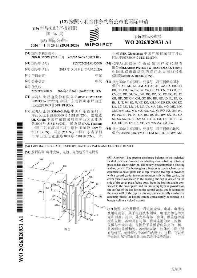 证券之星消息,根据企查查数据显示比亚迪(002594)公布了一项国际专利申请,专利名为“电池壳体、电池、电池包及用电设备”,专利申请号为PCT/CN2025/093700,国际公布日为2026年1月29日。