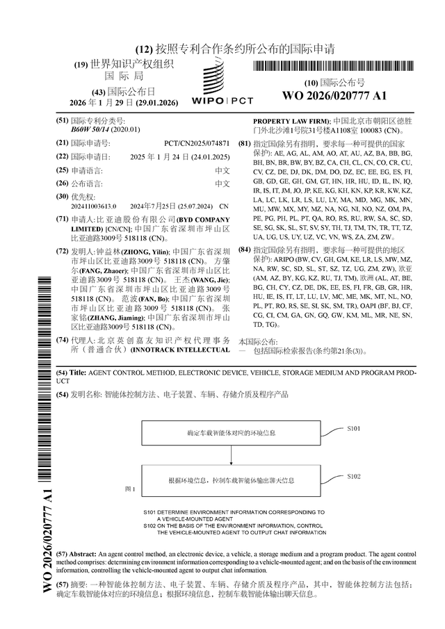 证券之星消息,根据企查查数据显示比亚迪(002594)公布了一项国际专利申请,专利名为“智能体控制方法、电子装置、车辆、存储介质及程序产品”,专利申请号为PCT/CN2025/074871,国际公布日为2026年1月29日。
