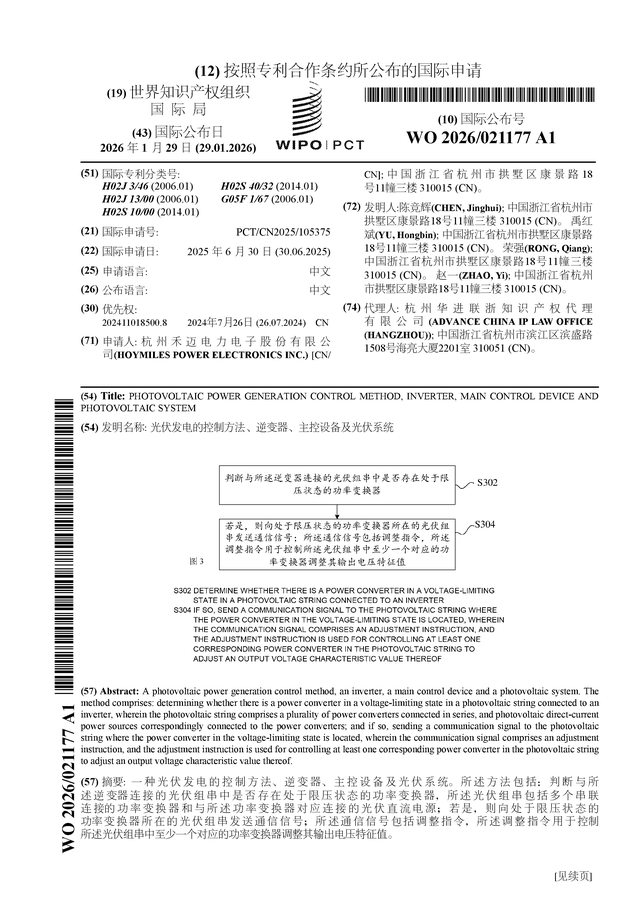 证券之星消息,根据企查查数据显示禾迈股份(688032)公布了一项国际专利申请,专利名为“光伏发电的控制方法、逆变器、主控设备及光伏系统”,专利申请号为PCT/CN2025/105375,国际公布日为2026年1月29日。