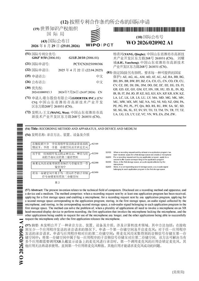 证券之星消息,根据企查查数据显示歌尔股份(002241)公布了一项国际专利申请,专利名为“录音方法、装置、设备及介质”,专利申请号为PCT/CN2025/090306,国际公布日为2026年1月29日。