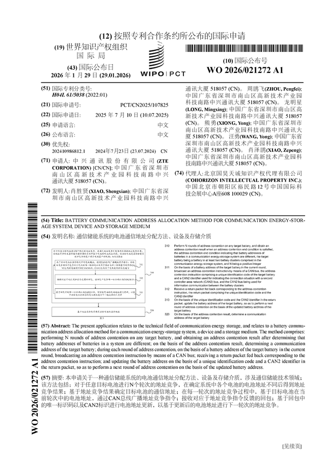 证券之星消息,根据企查查数据显示中兴通讯(000063)公布了一项国际专利申请,专利名为“通信储能系统的电池通信地址分配方法、设备及存储介质”,专利申请号为PCT/CN2025/107825,国际公布日为2026年1月29日。
