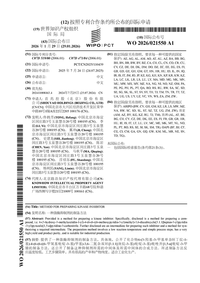 证券之星消息,根据企查查数据显示首药控股(688197)公布了一项国际专利申请,专利名为“一种激酶抑制剂的制备方法”,专利申请号为PCT/CN2025/110439,国际公布日为2026年1月29日。