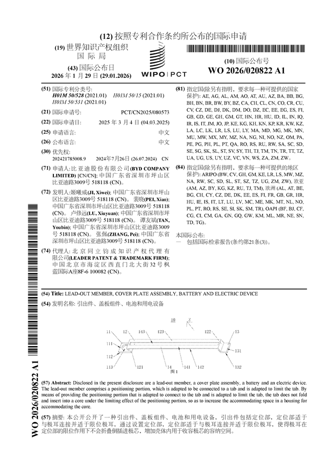 证券之星消息,根据企查查数据显示比亚迪(002594)公布了一项国际专利申请,专利名为“引出件、盖板组件、电池和用电设备”,专利申请号为PCT/CN2025/080573,国际公布日为2026年1月29日。