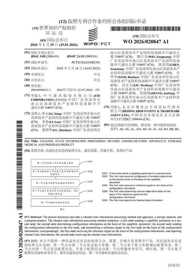 证券之星消息,根据企查查数据显示中兴通讯(000063)公布了一项国际专利申请,专利名为“信道状态信息的处理方法、通信装置、存储介质、及程序产品”,专利申请号为PCT/CN2025/082763,国际公布日为2026年1月29日。