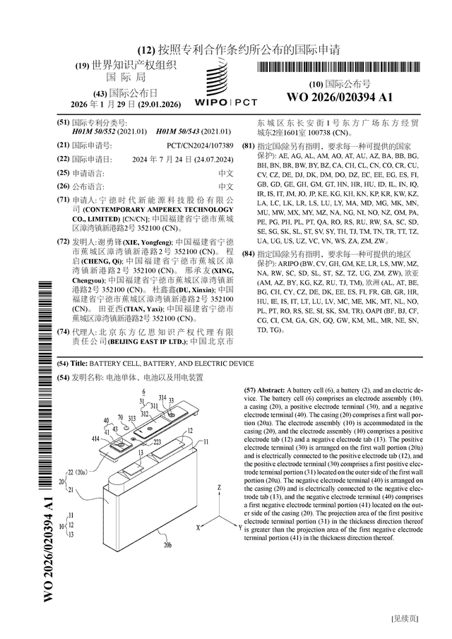 证券之星消息,根据企查查数据显示宁德时代(300750)公布了一项国际专利申请,专利名为“电池单体、电池以及用电装置”,专利申请号为PCT/CN2024/107389,国际公布日为2026年1月29日。