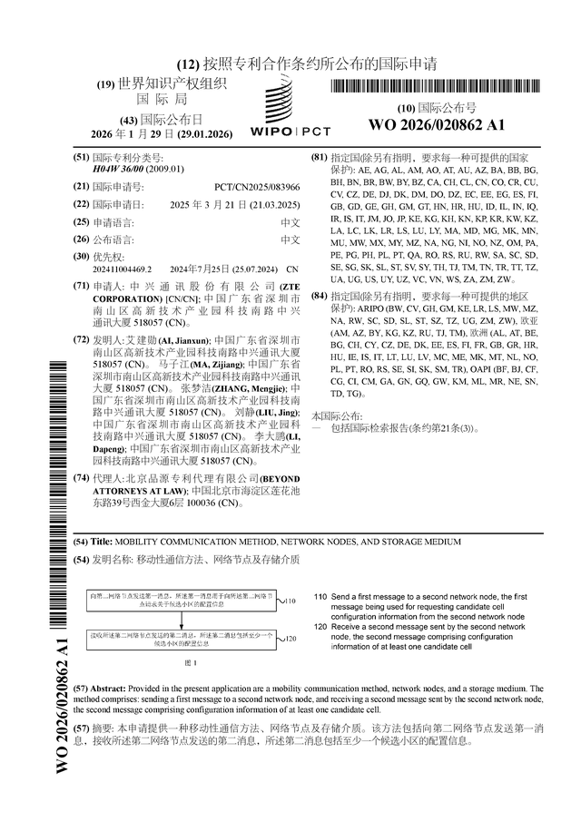 证券之星消息,根据企查查数据显示中兴通讯(000063)公布了一项国际专利申请,专利名为“移动性通信方法、网络节点及存储介质”,专利申请号为PCT/CN2025/083966,国际公布日为2026年1月29日。