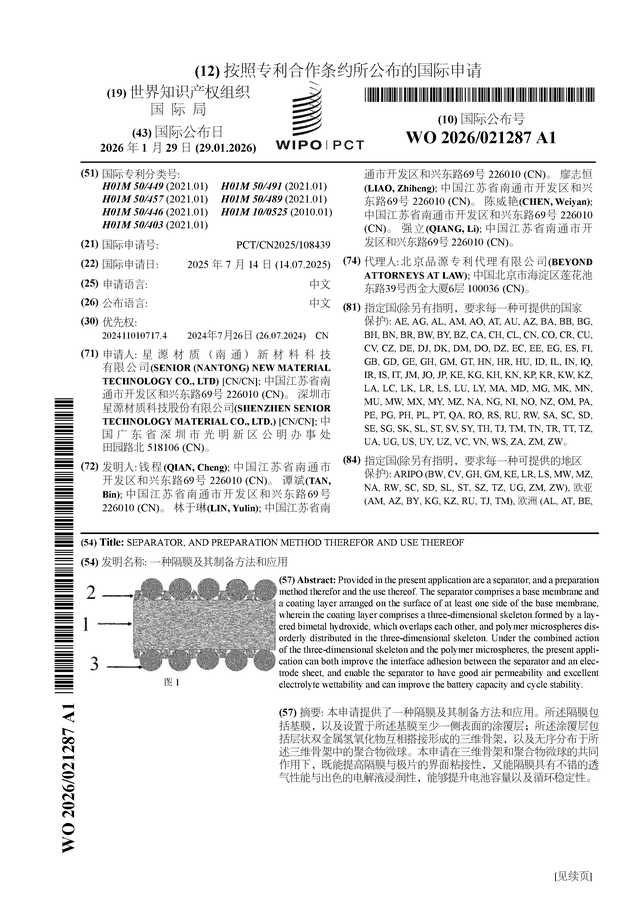 证券之星消息,根据企查查数据显示星源材质(300568)公布了一项国际专利申请,专利名为“一种隔膜及其制备方法和应用”,专利申请号为PCT/CN2025/108439,国际公布日为2026年1月29日。