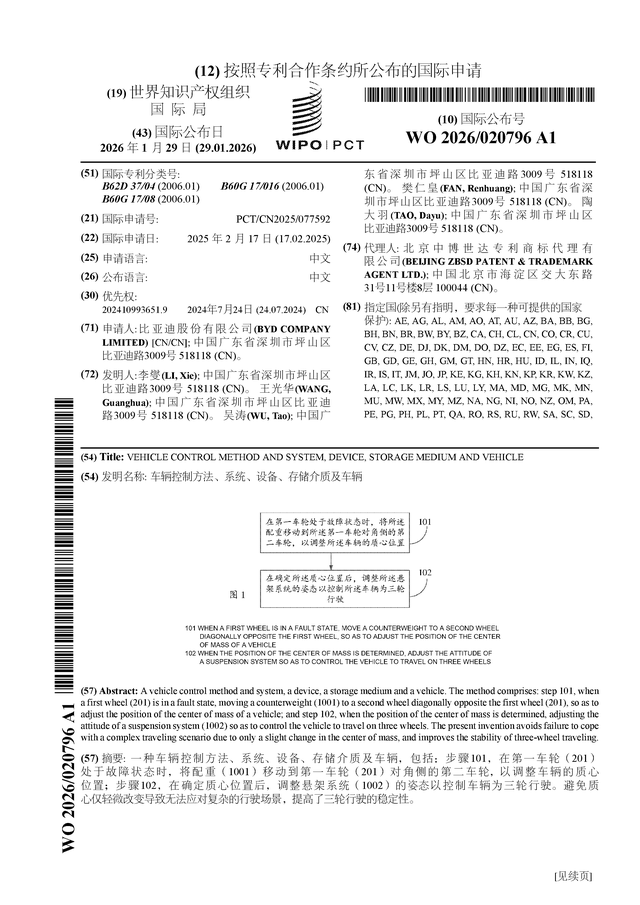 证券之星消息,根据企查查数据显示比亚迪(002594)公布了一项国际专利申请,专利名为“车辆控制方法、系统、设备、存储介质及车辆”,专利申请号为PCT/CN2025/077592,国际公布日为2026年1月29日。