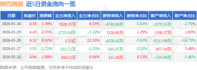 证券之星消息,截至2026年1月30日收盘,陕西黑猫(601015)报收于4.58元,上涨3.39%,换手率8.82%,成交量180.13万手,成交额8.44亿元。