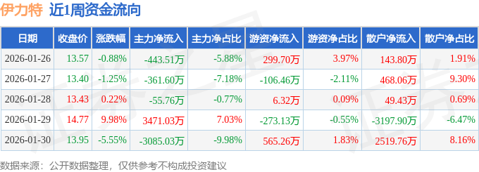 资金流向数据方面,本周伊力特主力资金合计净流出474.86万元,游资资金合计净流入491.7万元,散户资金合计净流出16.85万元。本周资金流向一览见下表: