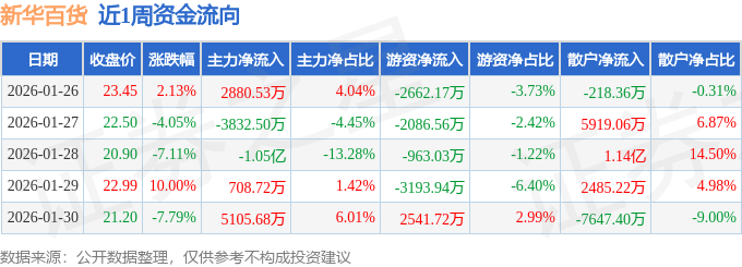 资金流向数据方面,本周新华百货主力资金合计净流出5611.53万元,游资资金合计净流出6363.98万元,散户资金合计净流入1.2亿元。本周资金流向一览见下表: