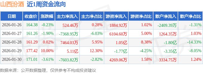 资金流向数据方面,本周山西汾酒主力资金合计净流入4.41亿元,游资资金合计净流入5111.86万元,散户资金合计净流出4.92亿元。本周资金流向一览见下表: