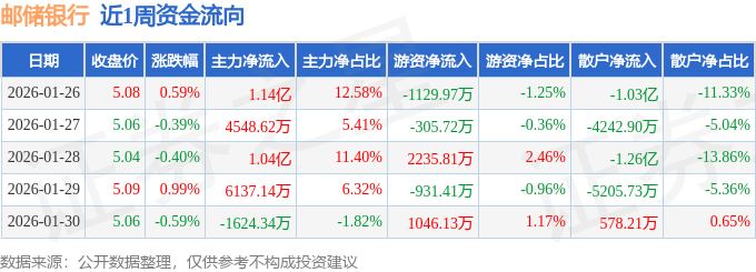 资金流向数据方面,本周邮储银行主力资金合计净流入3.08亿元,游资资金合计净流入914.84万元,散户资金合计净流出3.17亿元。本周资金流向一览见下表: